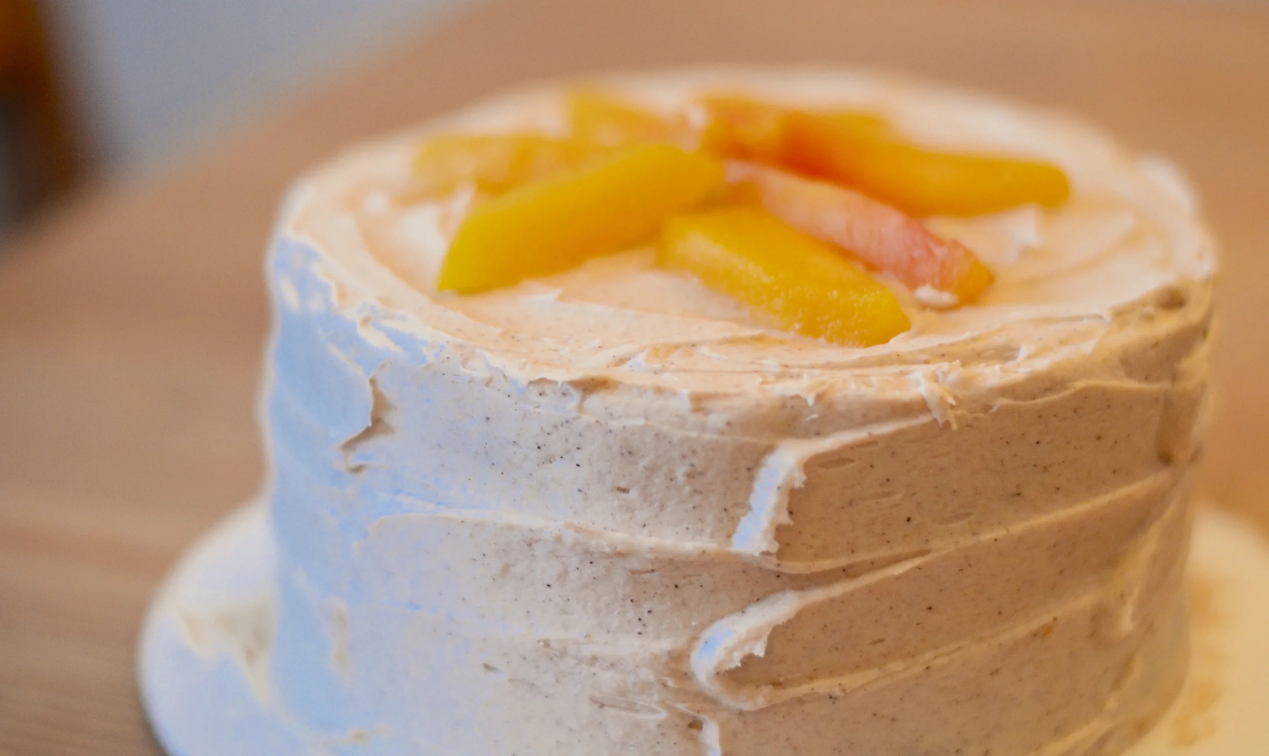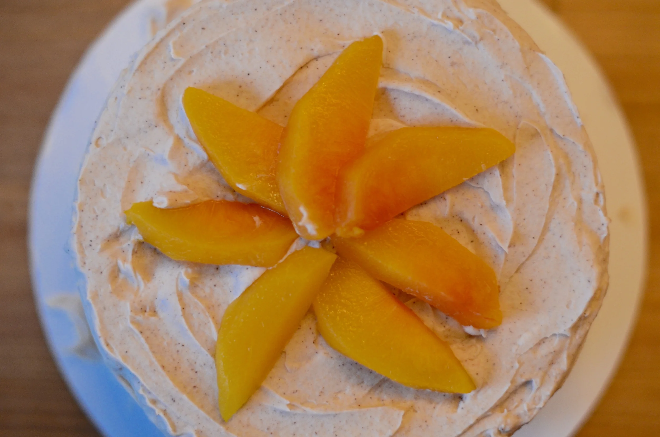 For the icing, cream butter and cream cheese in a stand mixer until light and fluffy. Gradually add powdered sugar until well combined, then vanilla, cinnamon, and caramel. Make sure all ingredients are fully incorporated, and your set. Ice that cake and top it with some peaches and make some people smile.